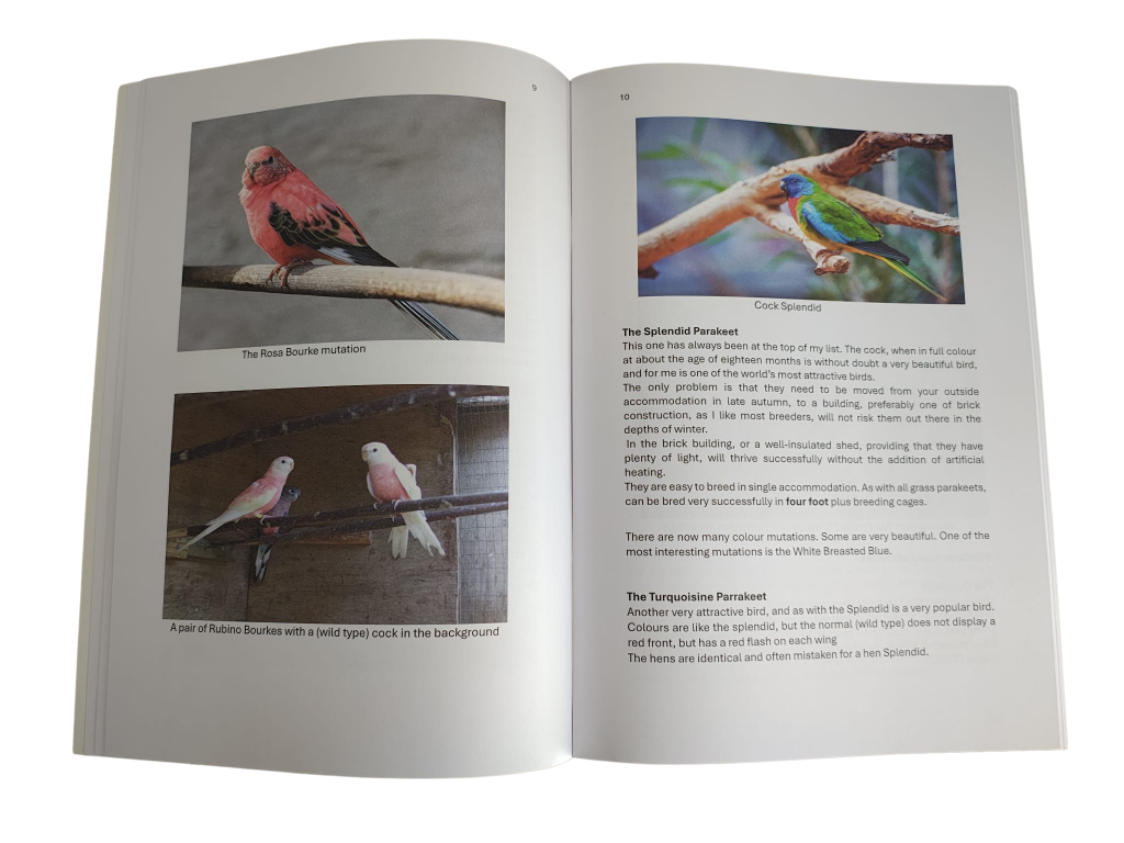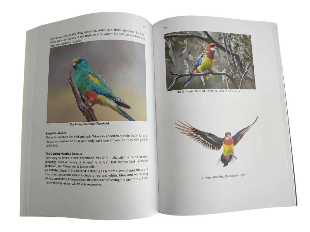 It contains the following: The Australian Parakeets small, medium and large+ Nest box making and sizes+ Feed and medication+ Choosing breeding stock+ Selling your surplus stock+ Equipment and accessories+ Record keeping+ Ringing your birds+ DNA sexing+ Bird pricing+ Distance buying and selling+ And much more.